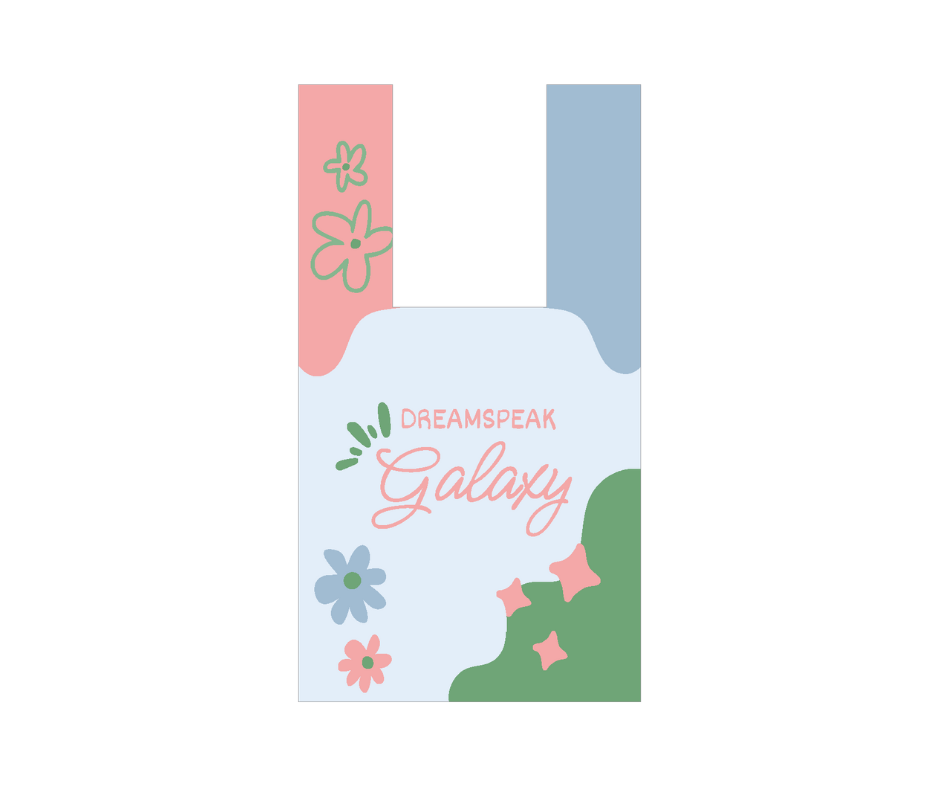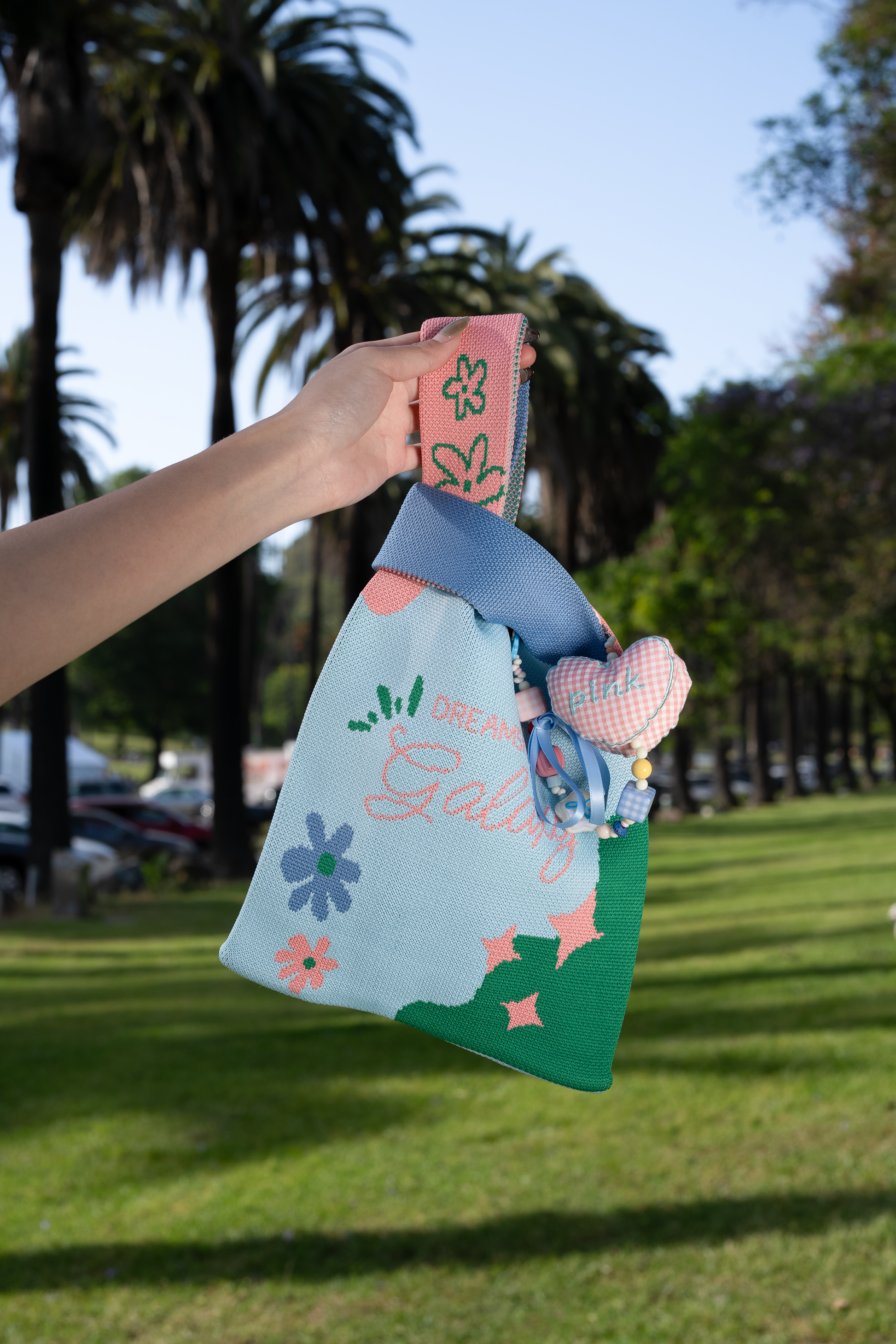 Part of the DreamSpeak Galaxy packaging collection, the DreamSpeak Galaxy shopper tote is an original creation developed by the brand’s in-house design team and has become a hallmark of its playful, cosmic-garden aesthetic. Designed to hold and present our signature knit mini bags, it’s printed with a vibrant medley of abstract floral and star motifs across seven pastel colorways, evoking a whimsical blend of nature and starlight. Emblazoned with the “DreamSpeak Galaxy” logo on the front, the medium tote exemplifies the brand’s commitment to quality craftsmanship and eco-conscious design, and may be carried by hand or looped over the wrist, as well as paired with matching gift sleeves and labels for a fully immersive unboxing experience.